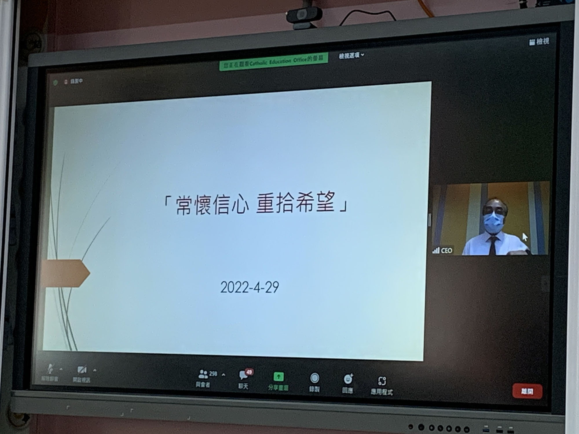 2022年4月29日為天主教香港教區教師發展日,當日以視像會議ZOOM形式進行「常懷信心 重拾希望」研討會。當天大會邀請了香港教區主教周守仁神父、甘寶維副主教、教育事務主教代表龔廣培及註冊教育心理學家黃嘉茵女士作嘉賓。透過講者的分享,讓老師了解過去兩年社會及校園生活的變化對成長中幼兒的影響。周神父亦勉勵教育同工,當面對不同的處境時,身為教育者的我們需時常懷着信心和希望,教導學生以豁然開朗之情領悟生命的意義,並且鼓勵校長及老師們同心攜手,共同孕育身心靈健康的幼兒。