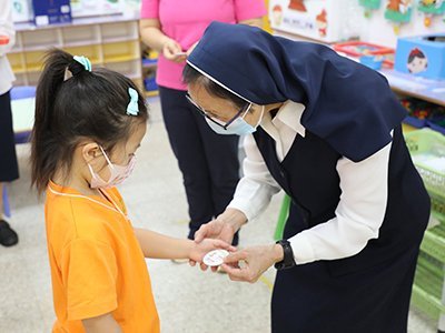 甘修女向每位隊員頒發團章,並祝福他們緊記時時常懷喜樂感恩的心,以言以行實踐愛主愛人的精神,然後大家一起合唱團歌作結束。